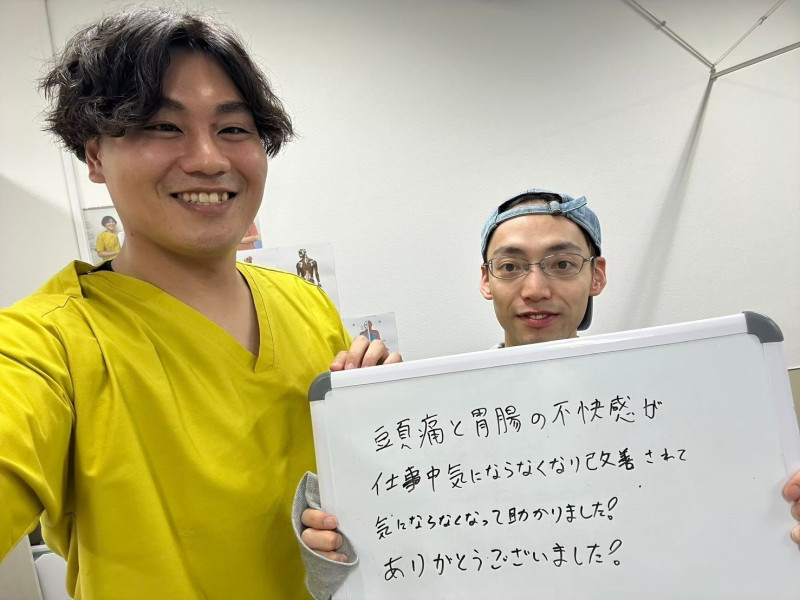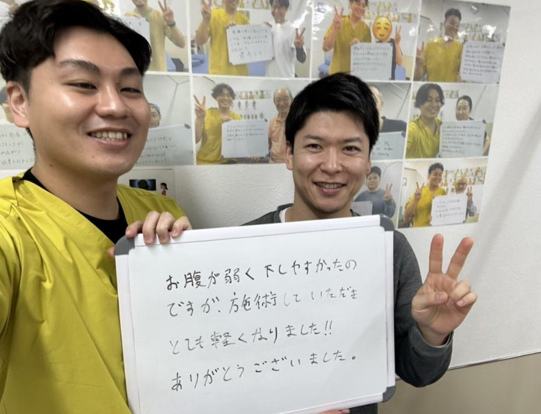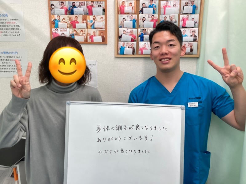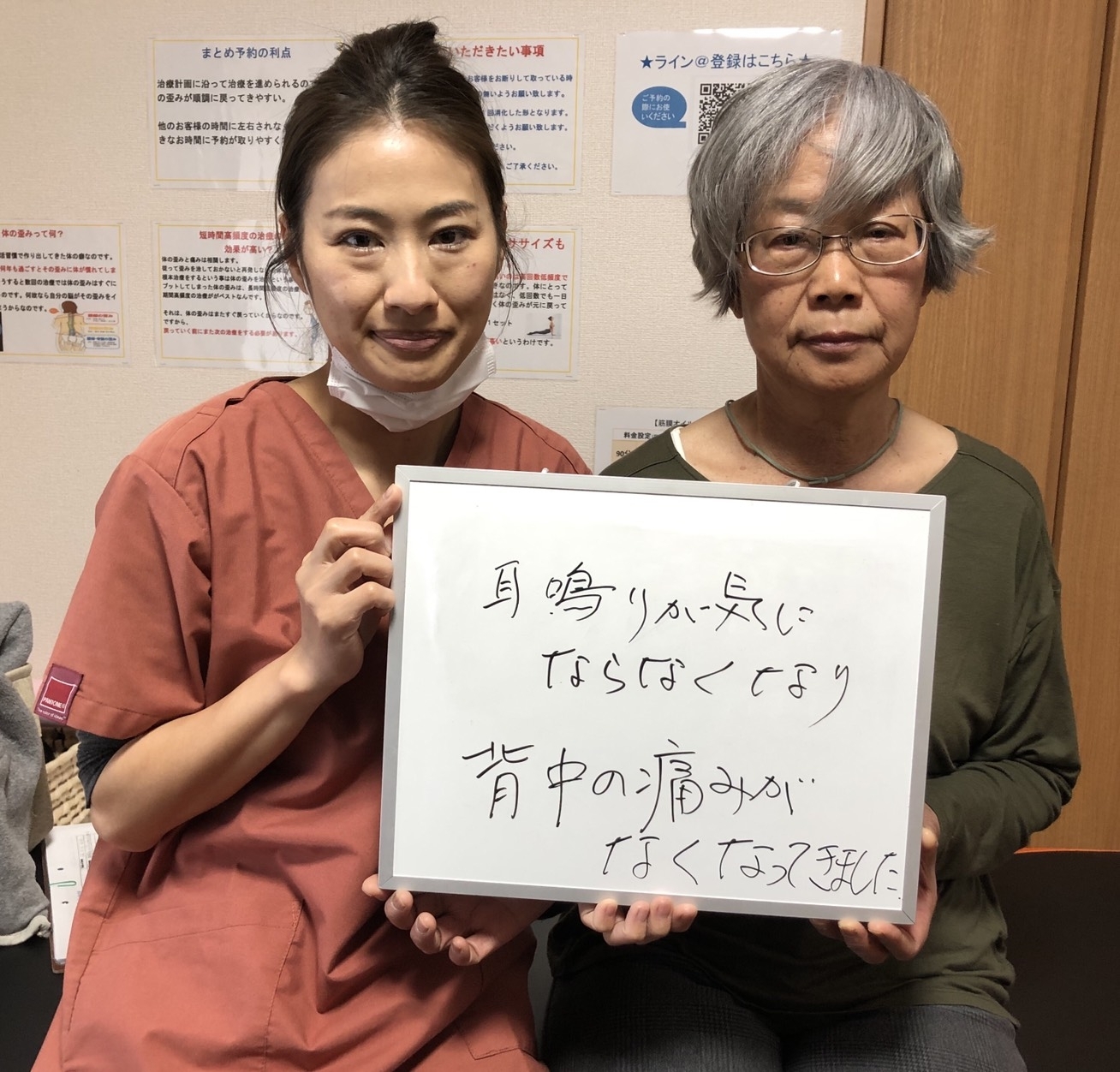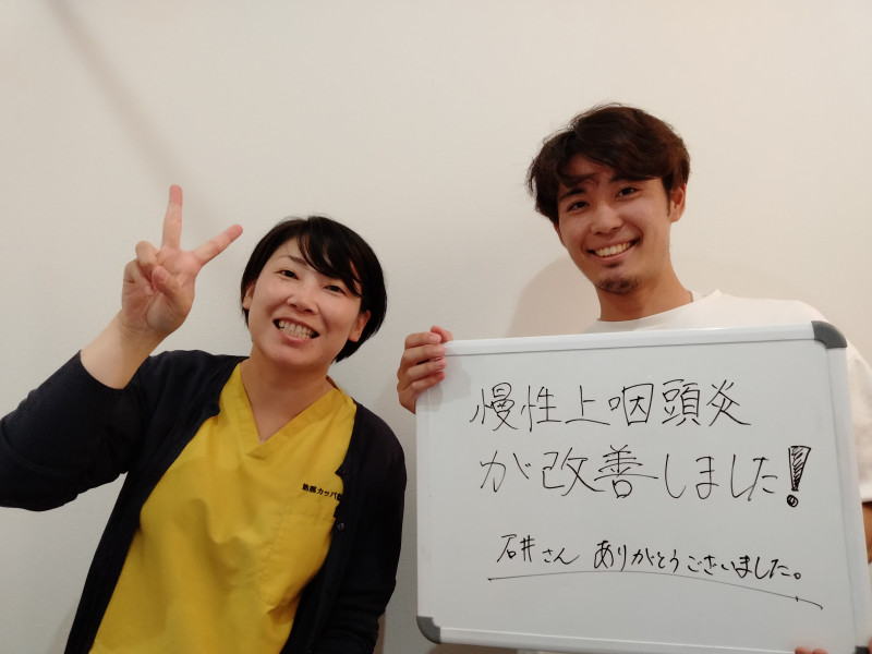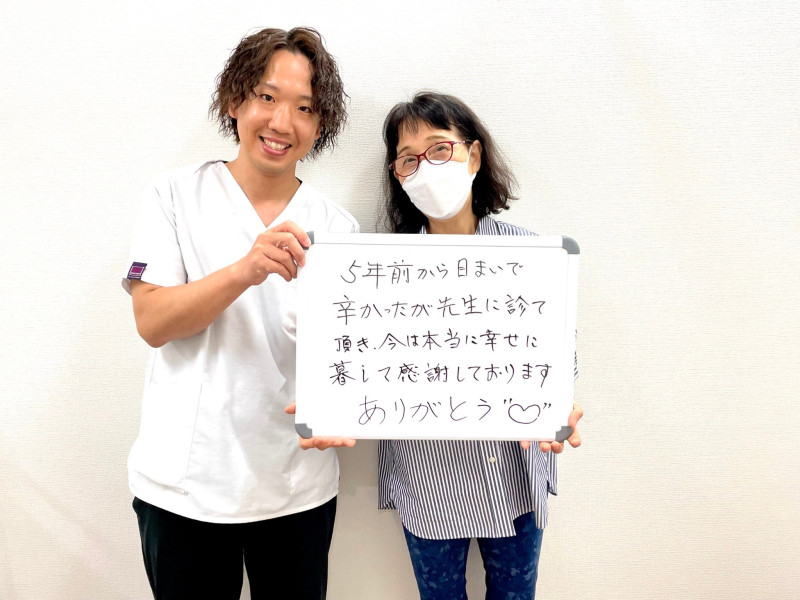 Q、あなたと同じような症状でお悩みの皆様へメッセージがありましたら教えてください。 A、是非一度、来院して先生の施術を受けたら良いと思います!私の実感として絶対に良くなりますよ!