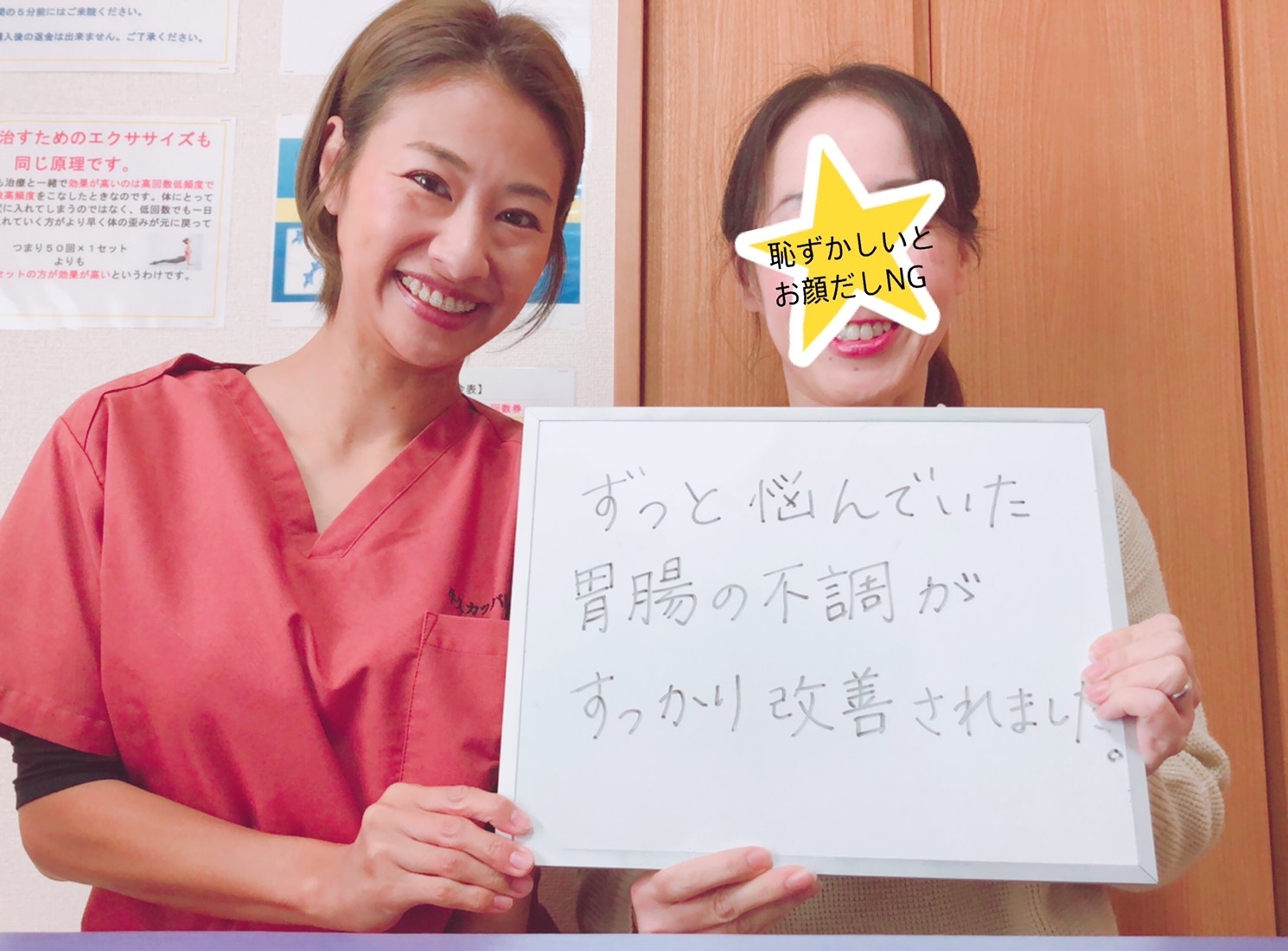 Q、あなたと同じような症状でお悩みの皆様へメッセージがありましたら教えてください。 A、病院で原因が分からなかったり、ストレス、と言われて終わってしまう症状も、丁寧な施術とコミュニケーションで整体を行い、改善してくださいました。