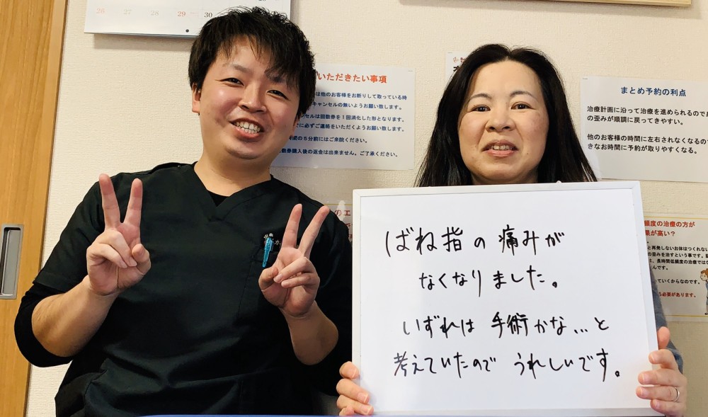 A、症状の軽かった右親指の痛みは数回で良くなり、左親指の痛みも改善してきてタオルを絞る事ができるようになりました。そして体が楽になりました。