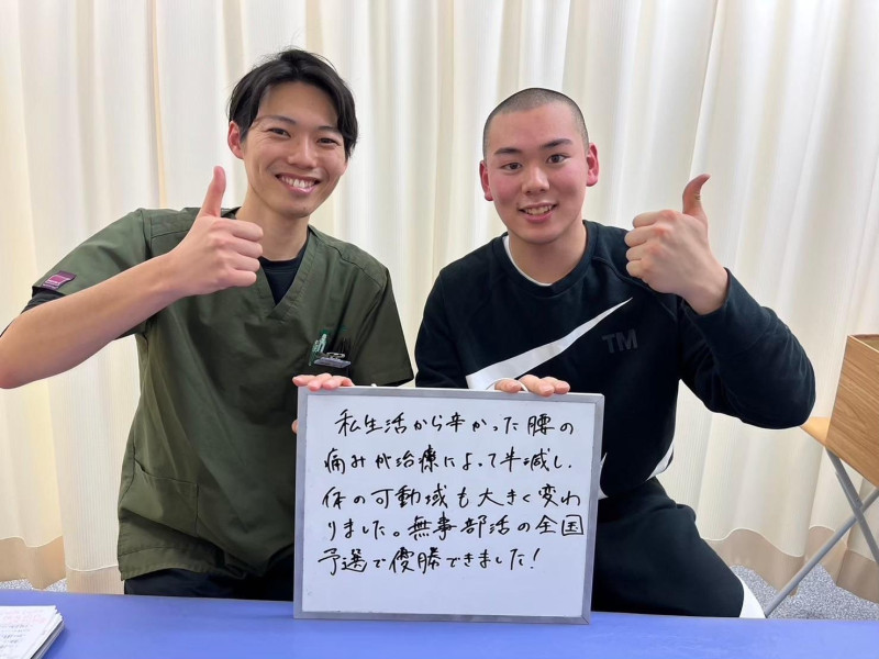 選手権前に腰を痛め練習もままならない状況でしたが、こちらで施術してもらい腰が良くなりました。ストレッチなどもたくさん教えて下さいました。